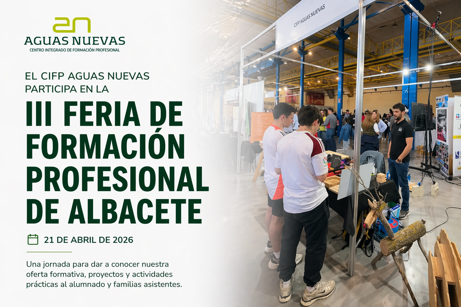 El CIFP Aguas Nuevas participó el pasado 21 de abril en la III Feria de Formación Profesional de Albacete, celebrada en la Institución Ferial de Albacete, IFAB. La feria reunió a centros educativos, alumnado y entidades con el objetivo de dar a conocer la oferta formativa de Formación Profesional y su conexión