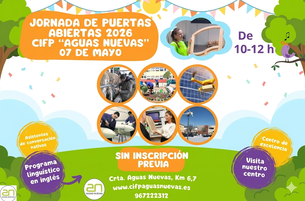 El CIFP Aguas Nuevas celebrará su Jornada de Puertas Abiertas el próximo 7 de mayo, en horario de 10:00 a 12:00 h, ofreciendo a todos los asistentes la oportunidad de conocer de primera mano el día a día del centro. Durante la jornada, los visitantes podrán recorrer las instalaciones, descubrir
