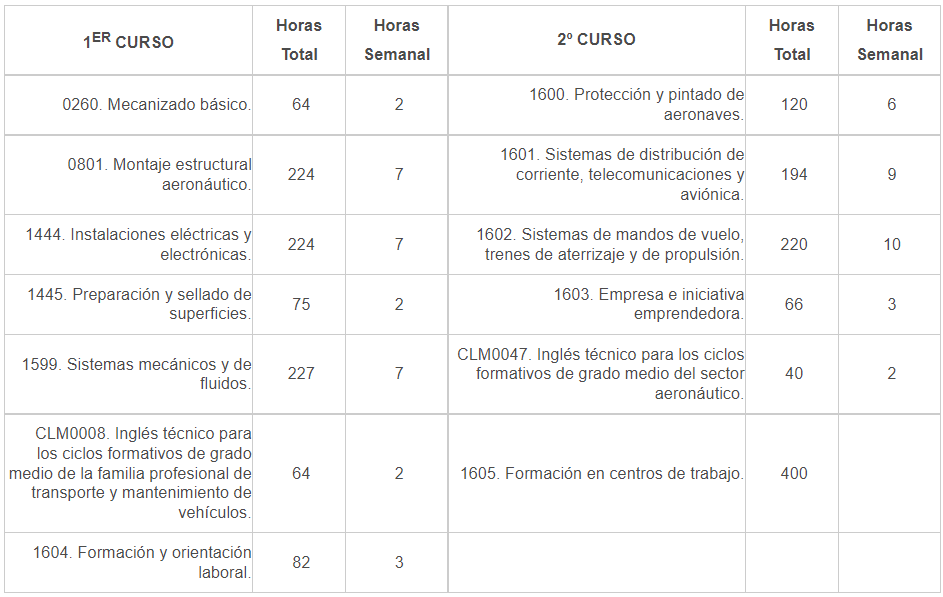 Horas Totales | Horas Semanales 1º Curso | Horas Semanales 2º Curso |
