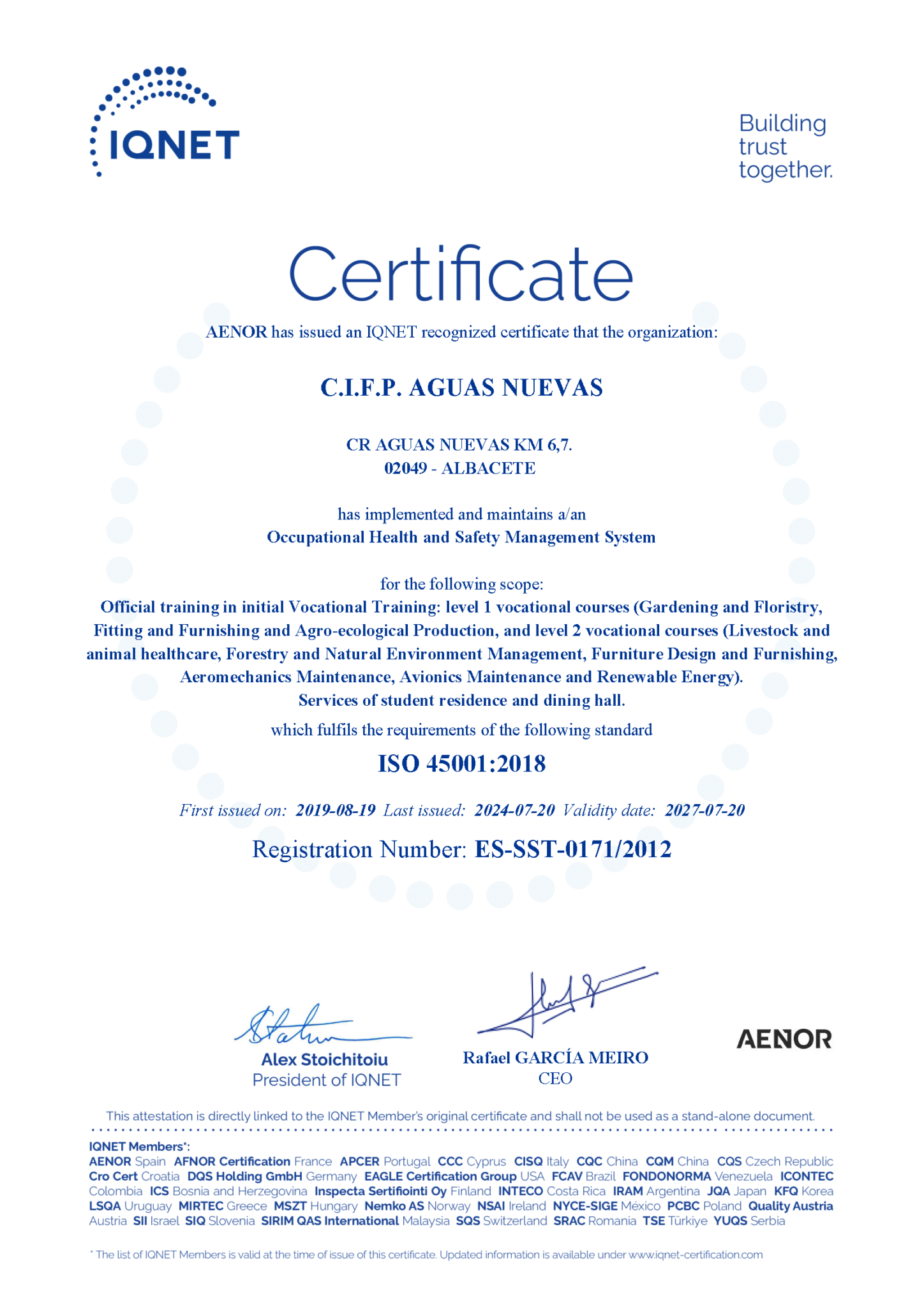 El CIFP Aguas Nuevas posee un sistema de gestión de la Seguridad y Salud en el Trabajo certificado, basado en la norma ISO 45001, que es un estándar internacional para la gestión de la seguridad y salud laboral y que significa para el centro el compromiso proactivo con la prevención de accidentes y la creación de un entorno seguro para toda la comunidad educativa.